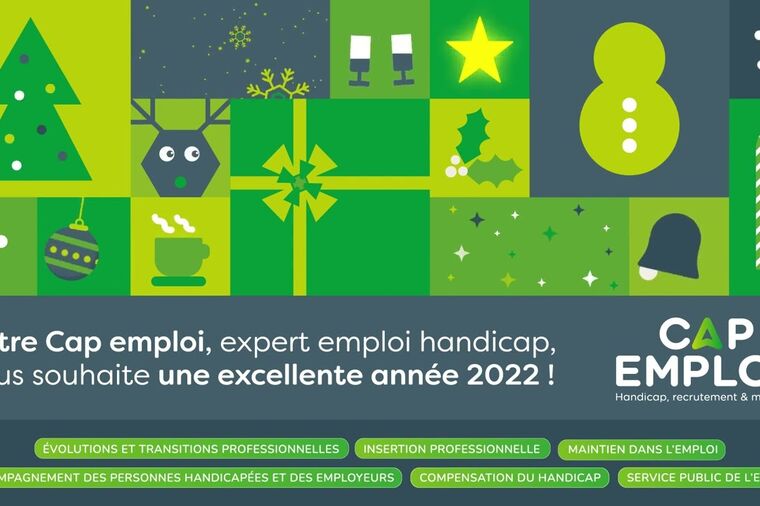 transcription : Vidéo présentant la carte de voeux 2022 Cap emploi Texte de la carte : "Votre Cap emploi, expert emploi et handicap, vous souhaite une excellente année 2022. Cap emploi. évolutions et transitions professionnelles. Insertion professionnelle. Maintien dans l'emploi.Accompagnement des personnes handicapées et des employeurs. Compensation du handicap. Service Public de l'emploi"